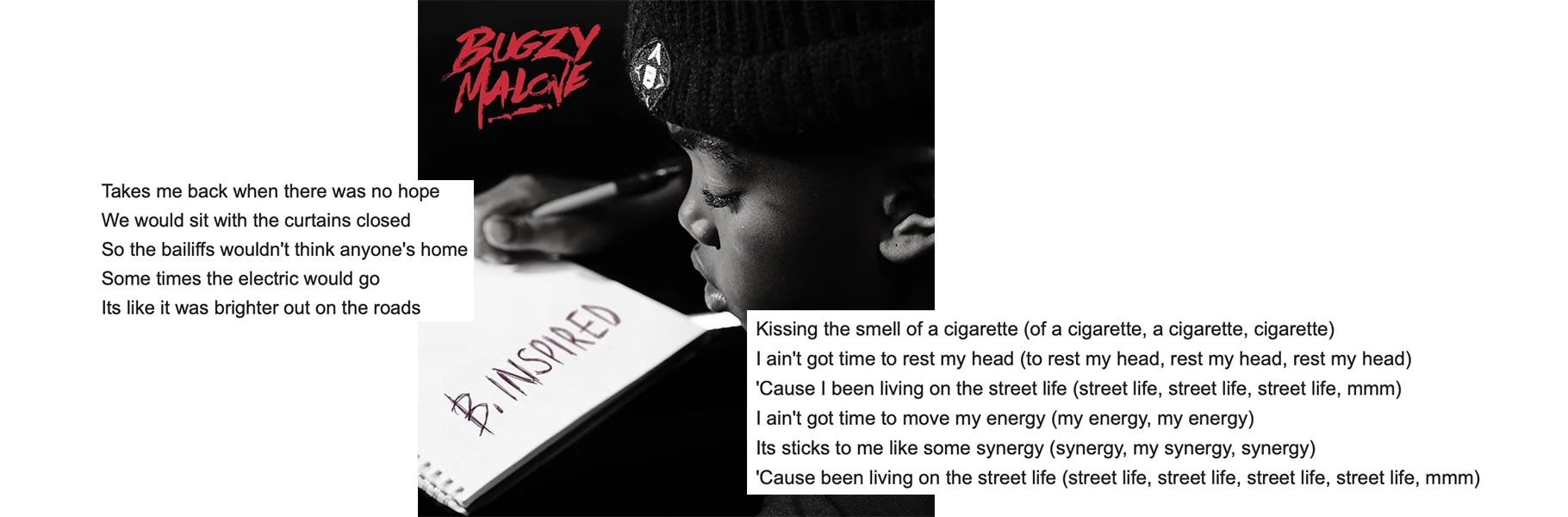 Another massive source of inspiration for this project is, believe it or not, a song. A track called ‘Street Life’ by Manchester rapper Bugzy Malone. Some of the lyrics really give off the right vibe that I want to set for this project, and the whole tone and tempo of the track just inspires me with ideas and motivation. There are a few bars throughout the track that most speak to me most and actually put an image in my head of which I would like to bring out and present by the end of this university course. Funnily enough, his album is actually titled ‘B. Inspired’ so I think it’s safe to say he has done his job with me!